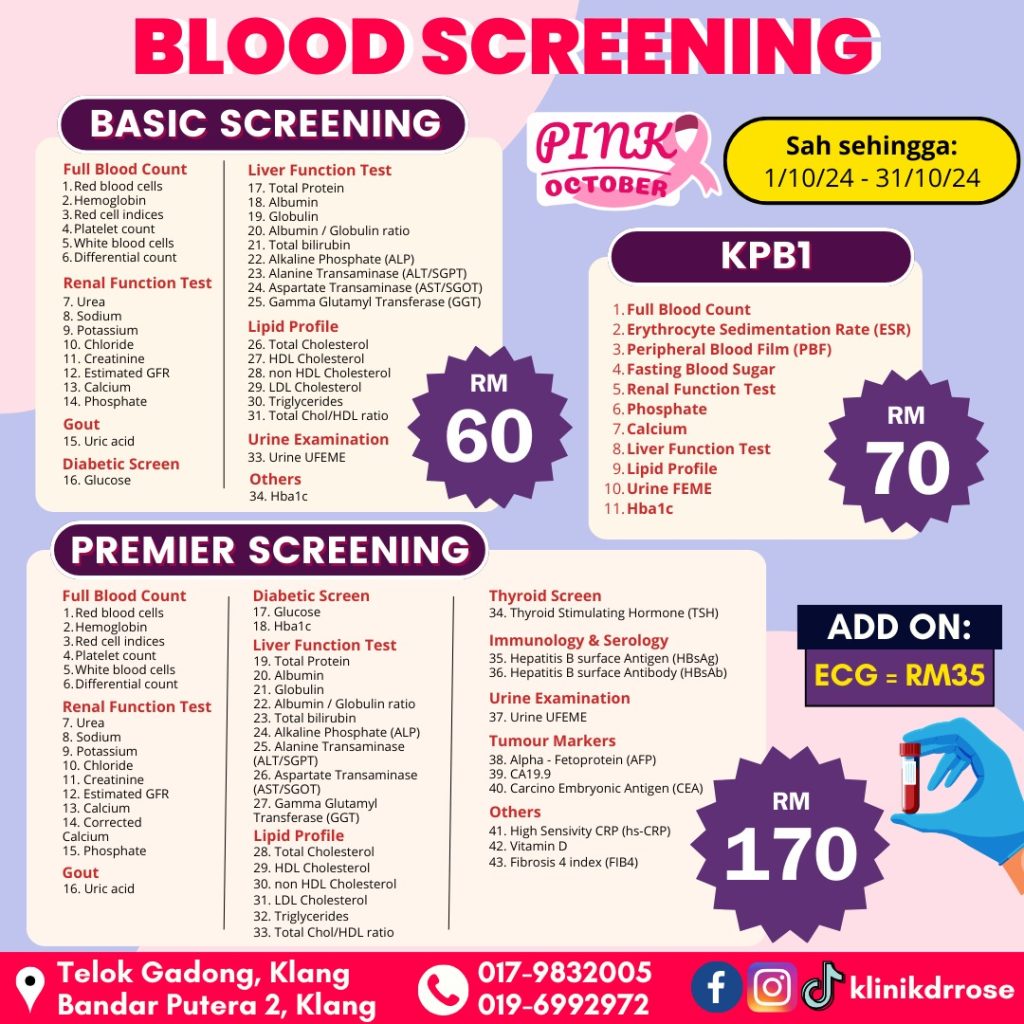 Kesimpulannya, amalkan cara hidup sihat dan kekalkan berat badan yang ideal. Makanlah makanan seimbang dan berkhasiat serta halal. Jom dapatkan pemeriksaan ujian darah di Klinik Dr Rose cawangan Jalan Kebun dan di cawangan Telok Gadong.